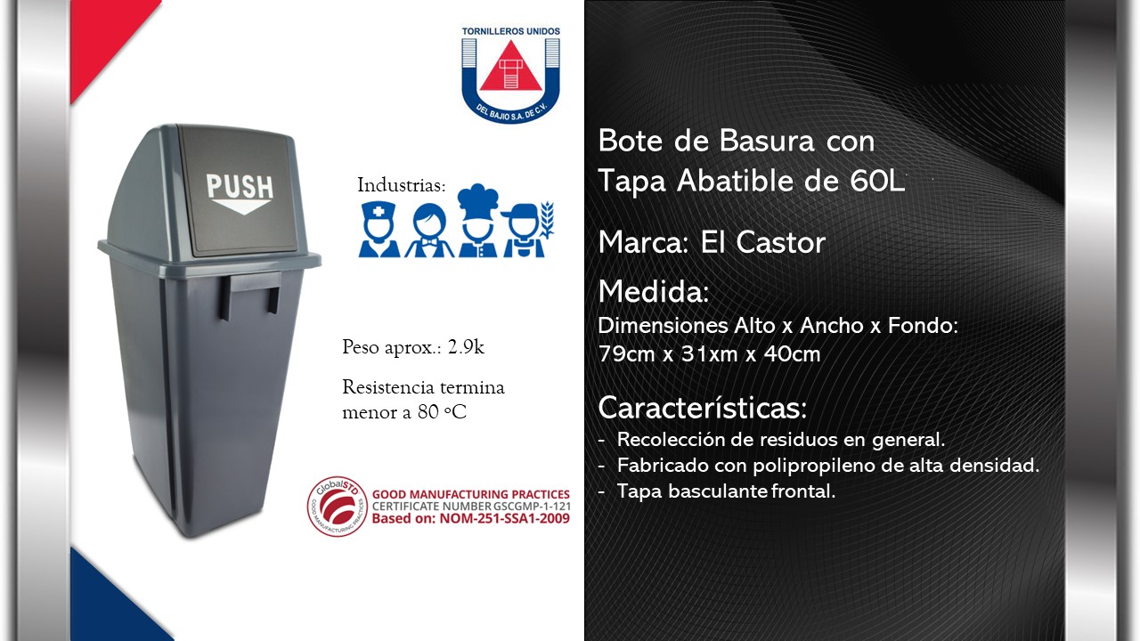 | CASTOR - BOTE DE BASURA 60 LITROS CON TAPA ABATIBLE COLOR GRIS | CASTOR – BOTE DE BASURA 60 LITROS CON TAPA ABATIBLE COLOR GRIS |