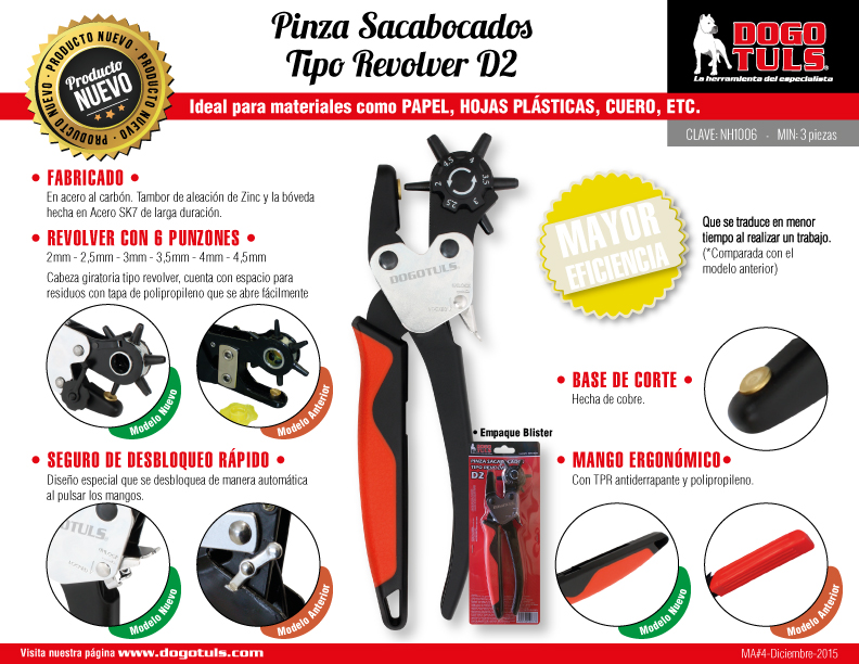 Cabeza giratoria tipo revolver con 6 medidas de sacabocados (2MM, 2.5MM, 3MM, 3.5MM, 4MM, 4.5MM).