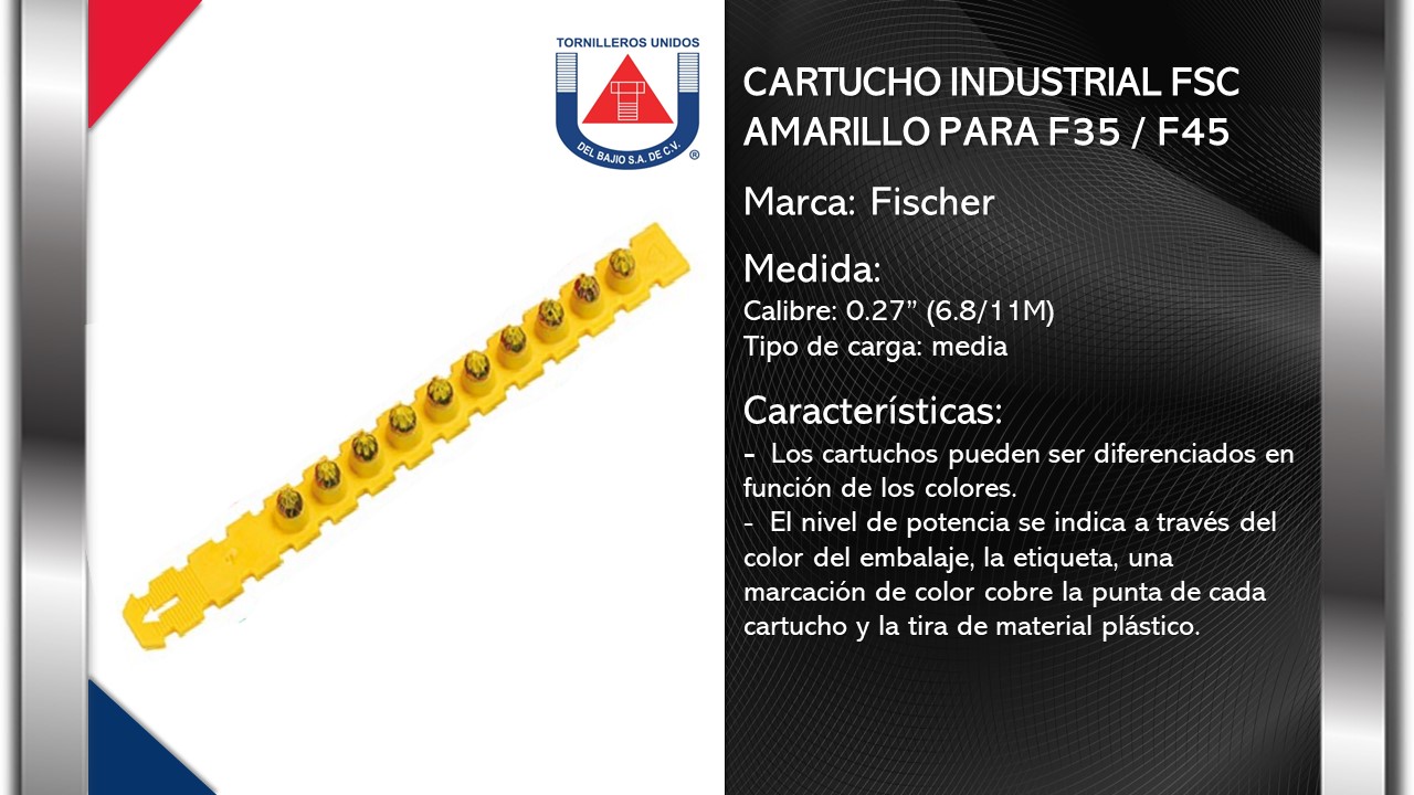 | FISCHER CARTUCHO INDUSTRIAL FSC AMARILLO 6.8/11M CAL 0.27" (1 TIRA) | FISCHER CARTUCHO INDUSTRIAL FSC AMARILLO 6.8/11M CAL 0.27" (1 TIRA) |